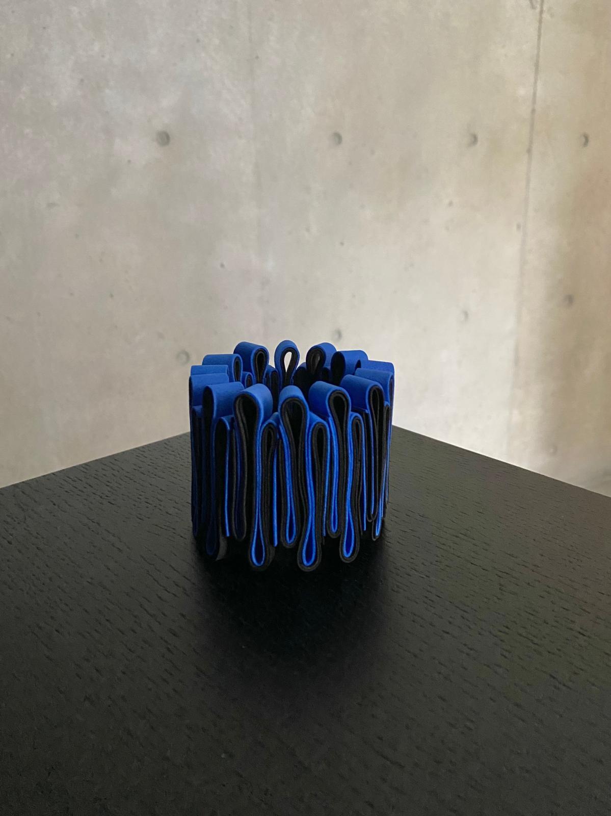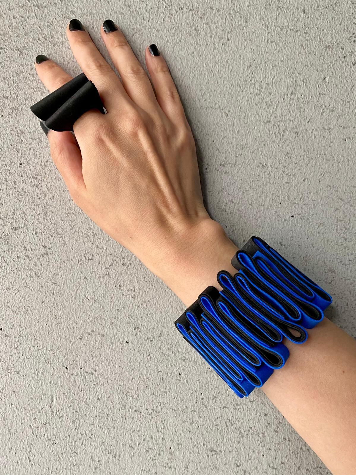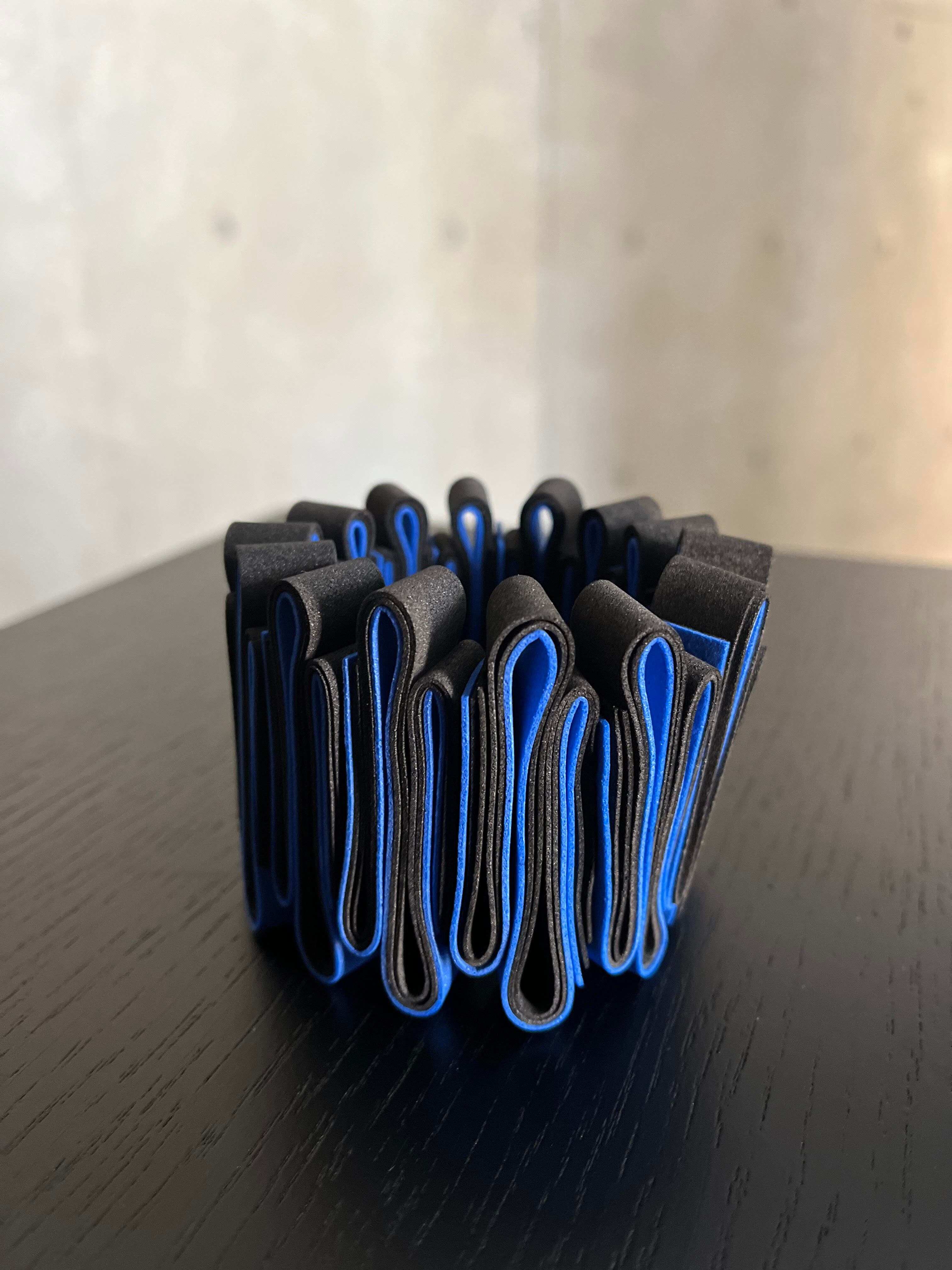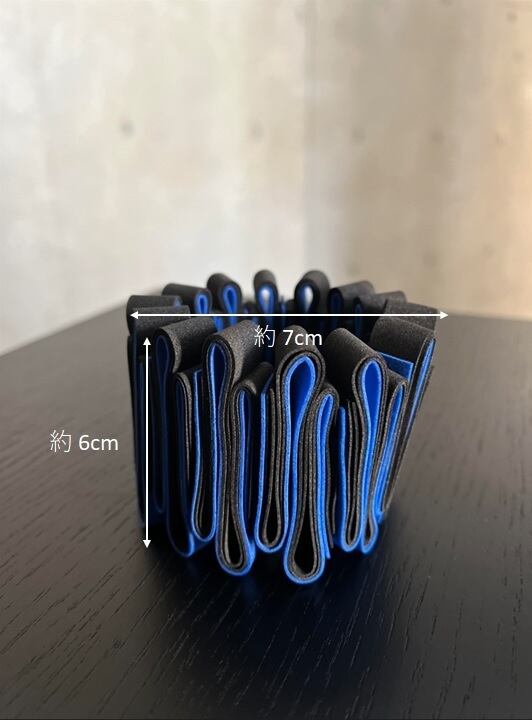 ユニークなデザインと軽やかな装着感が魅力のOnda Bracelet (blue x black)。青と黒のコントラストがクールな印象を与え、腕元をお洒落に彩ります。